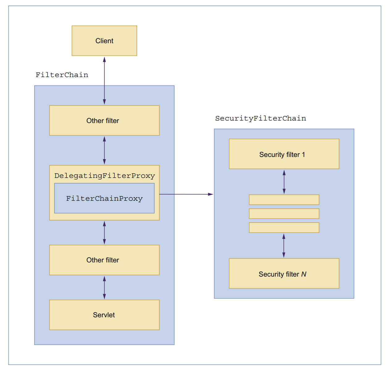 DelegatingFilterProxyis registered using standard Servlet container methods. - Delegation: It looks up a Spring Bean (e.g.,
